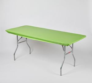 Our table covers have an elastic band around the edge (like a fitted sheet) so they stay on the table even on windy days. Fits our 8 ft long banquet tables.